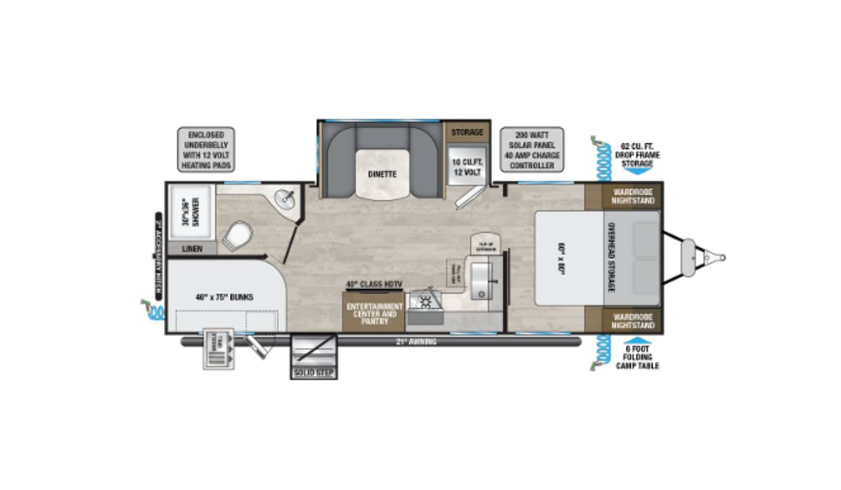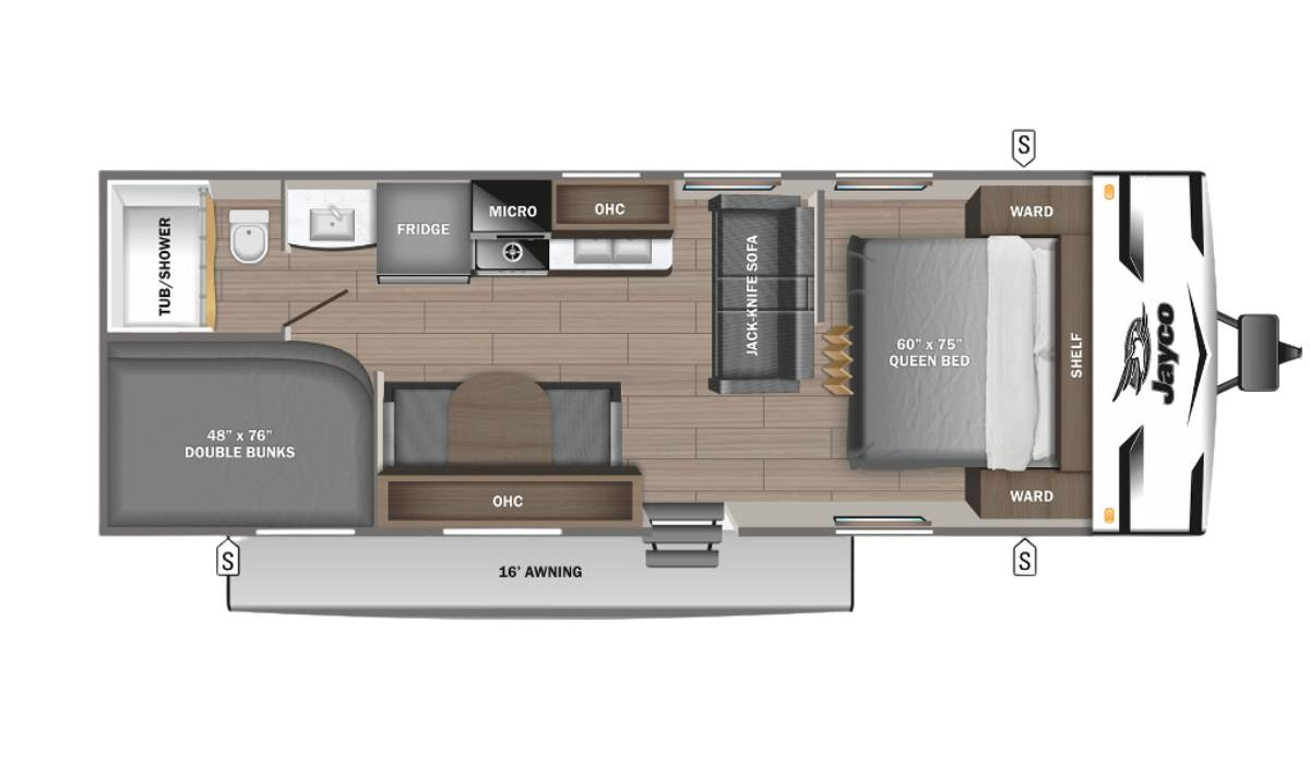 The Jayco Jay Flight SLX 260BHW is the perfect travel trailer to rent, buy, or rent out on a peer-to-peer RV rental marketplace like RVezy because of its reasonable price, sleeping space, and design. The large holding tanks, double-sized bunk beds, and roomy living area will bring a family or a group of friends together for a weekend getaway, music festival, or road trip. You'll love features like the residential kitchen, marine-grade bathroom fixtures, and entertainment components.