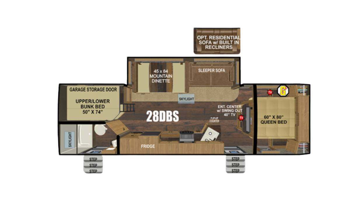 Outdoors RV trailers are built for rugged terrain, and the Backcountry Series 28DBS has everything you could want to camp off-road without hookups. The four-season components, fully enclosed sealed and heated underbelly, and extra insulation make ORV a cold-weather favorite, and the off-road suspension and tires will take you just about anywhere. Some of the features you'll love are the sportsmen's rack, mountain storage area, adult-sized bunk beds, and the family-sized, 12-volt refrigerator.