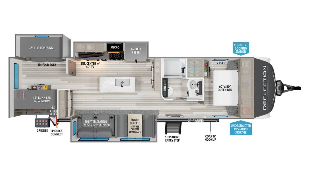 The Grand Design Reflection 312BHTS is perfect for families and groups seeking a luxurious, value-packed travel trailer. Its elegant interior includes residential hardwood cabinet doors and large panoramic slide-room windows that let in plenty of natural light. Some of the features you'll love are the two bedrooms —one with bunk beds and the other with a queen bed and a functional wardrobe closet. In addition, the Ultimate Power Package and Arctic 4-Seasons Protection Package make this travel trailer ideal for worry-free long-term stays and adventures wherever your travels might take you and your crew.