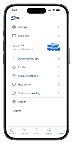 As a host, you will now default to hosting mode, allowing you to focus on managing your calendar, responding to inquiries, and handling your listings. If you want to rent, you can easily switch to travelling mode. This function operates just like in the RVezy app.