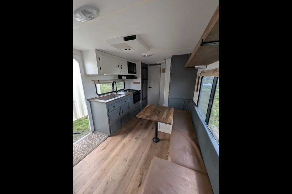 Small but cozy, with tonnes of hidden spots for storage. It's been updated, with paint, countertops, flooring, and more. There is a bonus space above the main bed, perfect for a toddler. The bunk beds and bonus bed have curtains, and the bunks have shelves.