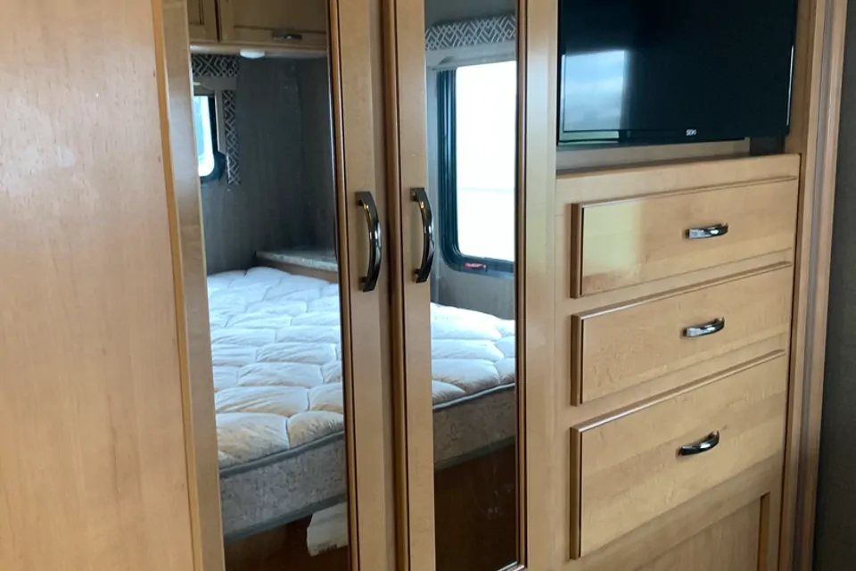 There is ample sleeping space with an over cab bed which can fit two adults or 3 children. A couch bed, a dinette bed, and our favorite feature, the slide out mini dinette area that converts into bunk beds with a mini TV on the top bunk. There is a queen bed in the fully enclosed bedroom in back, complete with TV & DVD player. You can stay extra cool and comfortable under the built in fan unit in the vent.