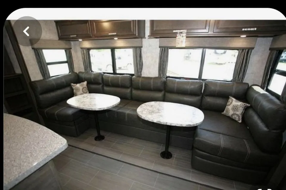 A very spacious and open concept living space with two bedrooms, two bathrooms, and two entrances. comfortably sleeps six. Large fridge, lots of storage, bike rack, and generator set up. Outdoor kitchen, barbecue, propane fire pit, lawn chairs. lawn games