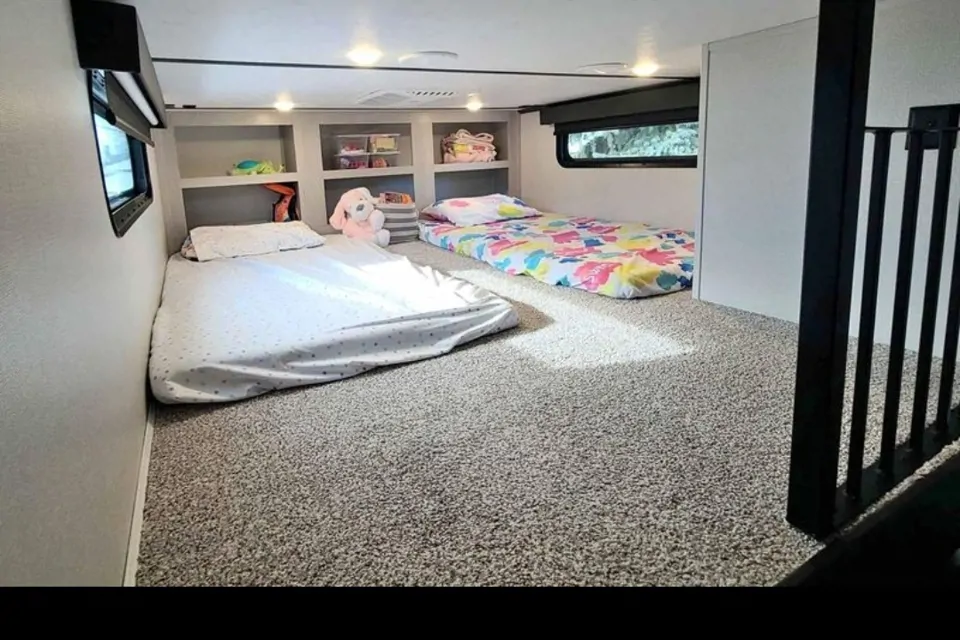This trailer has a super unique floor plan that allows for an awesome front living room while providing an excellent sized loft for kids above the rear main bedroom by utilizing a unique rear drop frame. The front room also has 2 fold out queen beds that allows the trailer to easily sleep 8 with a maximum of 10. The main door (passenger side) has great access to the upgraded residential fridge with the slides in while the unique second door (drivers side) has access to the bathroom and loft.