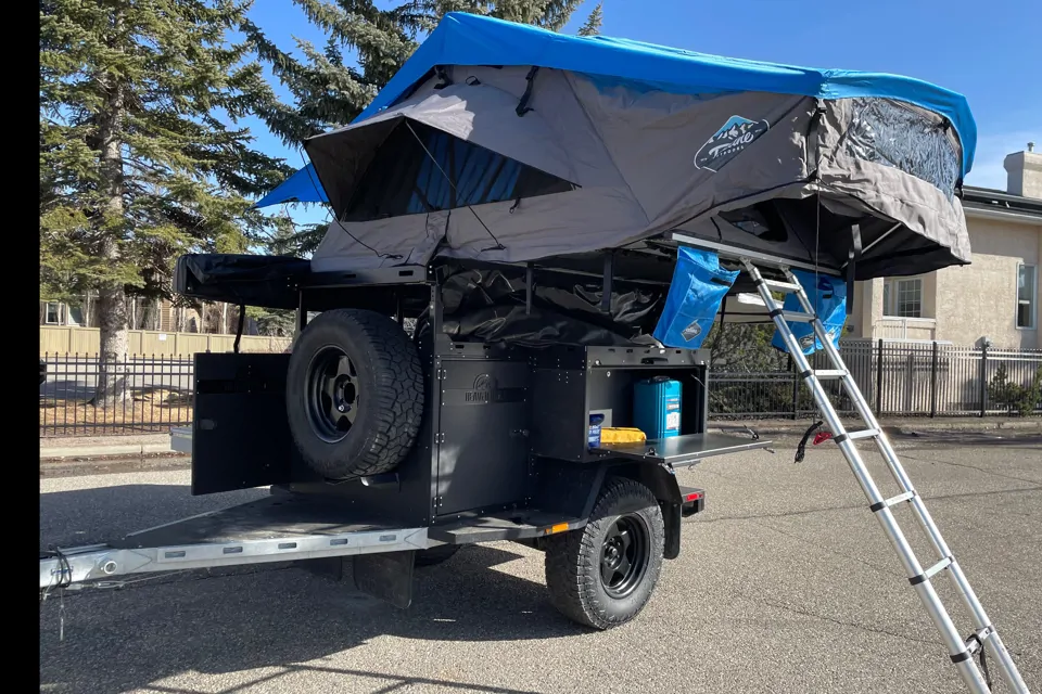 2021 Mahkesis Beaver Built Adventure Trailer, featuring a Treeline tent with a king-sized bed, full electric system, and kitchen management system including basic kitchen items. Tons of storage rooms for all your gear plus an additional compartment for clothes.
