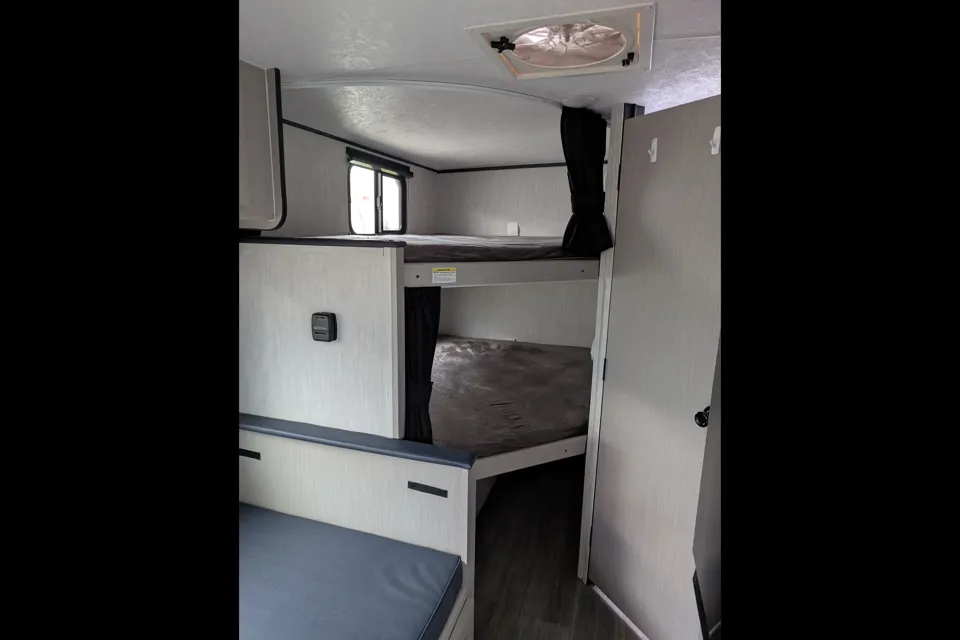 Double-size bunk beds in the rear corner, one of which can flip up for extra space,
