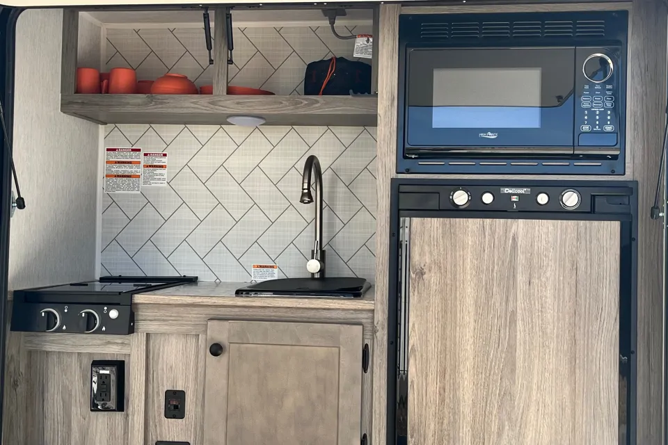 Best camping kitchen I've ever used. This is an awesome little unit and Dave was readily available to help with any questions. The unit had a little pot set, utensils, dish soap, salt and pepper. The chairs provided were good quality. It is a tight sleep for anyone over 6'1" though.