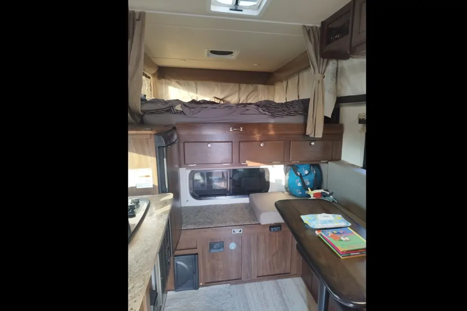 This camper is perfect for a couple, a solo traveler, or even a small family looking for adventure. Wake up to breathtaking mountain views, enjoy cozy evenings inside, and create unforgettable memories on the road. It’s easy to maneuver since it’s about the width of a regular pickup truck and comes equipped with a backup camera for added safety and convenience.