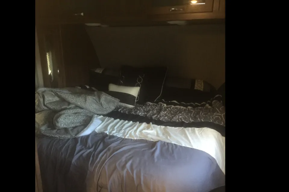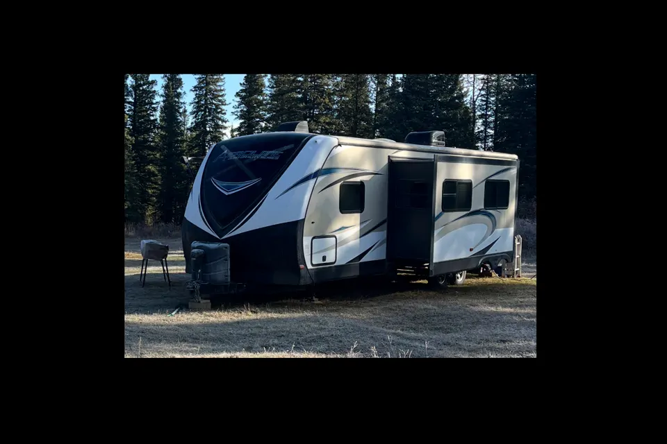 Enjoy the power slide-out, electric awning, A/C (13,500 BTU), and dual entry doors. Plenty of storage, interior/exterior speakers, and 2 TVs included. Easy tow with dual axles and aluminum frame.