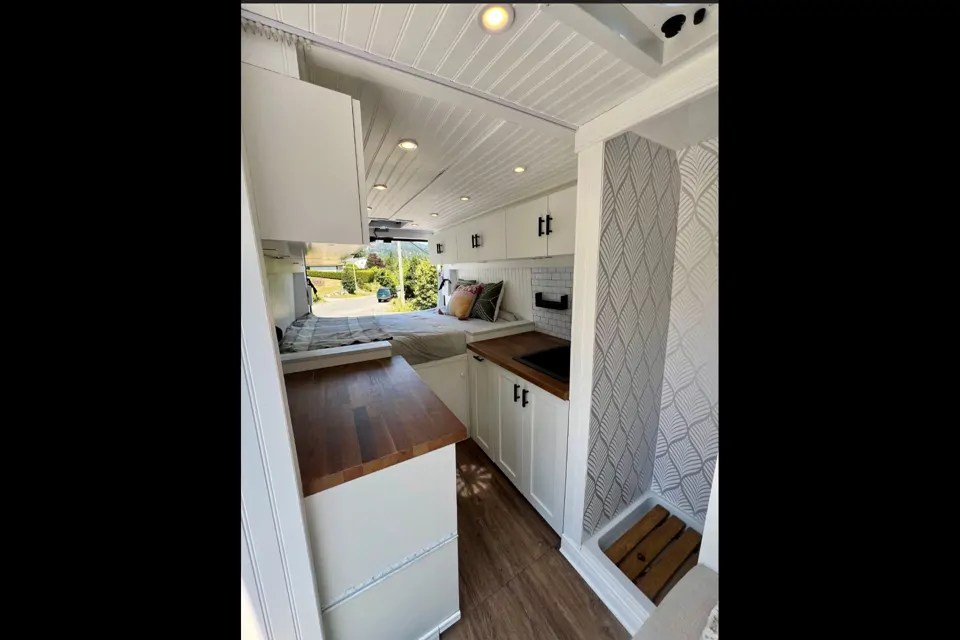 What sets Vinny apart? There is a full divider between the cab and living area and full window covers so he's not only stealthy enough to park anywhere but also a fantastic campground warrior, complete with shore power and direct water supply. Plus, we've upgraded Vinny with great all-terrain tires, ensuring you can confidently tackle any road less traveled. With three comfortable cab seats, everyone can join the journey, and you'll be amazed at how easy Vinny is to drive and maneuver, making every kilometer a breeze.