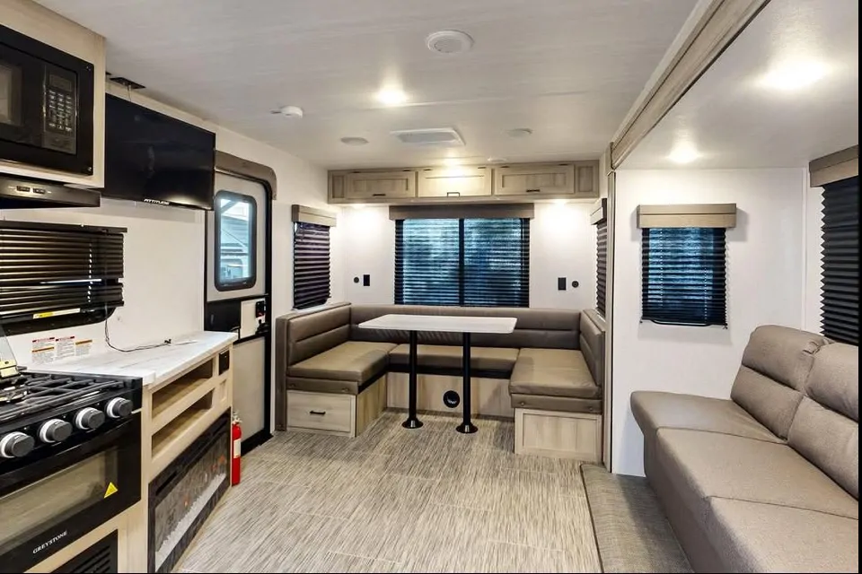 But the fun doesn't stop indoors! Our exterior features a convenient electric awning, perfect for enjoying al fresco dining or simply lounging in the shade on sunny days. Plus, with plenty of storage space for all your gear and gadgets, you can bring along everything you need for your adventure without any hassle.