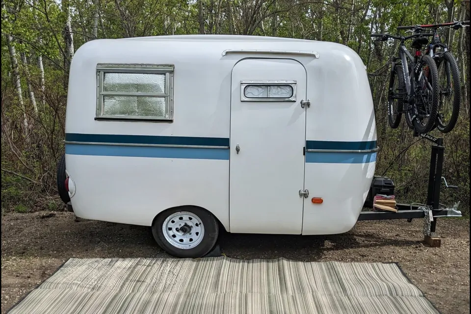 Meet Bruce The Boler. A 1972 Canadian made classic that keeps your camping adventure simple. This cozy trailer only weighs 1000 lbs empty with a 100 lbs tongue weight so it can confidently be towed behind most small vehicles. Bruce offers a single twin bed that converts into a dinning table as well as a couch that coverts into bunk beds for children under 60lbs. The interior kitchen area offers a hand pump sink and multiple cupboards for storage. Bedding is supplied for 1 twin bed(75"x45"). Sleeping bags are recommended for kids bunk bed use. A bike rack and/or portable cooking stove can be included at an additional cost with a 5lbs propane tank. If you want to keep camping simple and fun and enjoy the outdoors but don't want to sleep in a tent than Bruce is right for you.