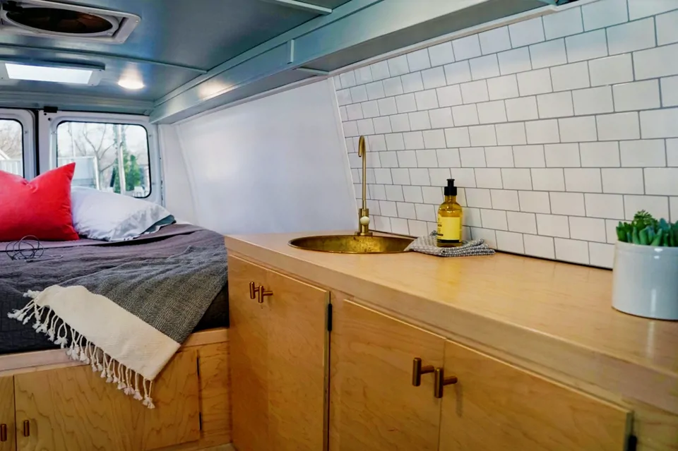 -Queen sized bed, power (solar panels w. inverter system), lighting, skylight, built-in fan/vent, running water & an electric cooler.