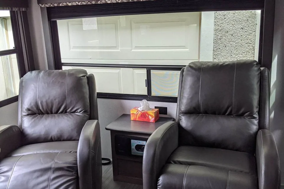 Very homey couples/small family trailer. Dual leather recliners, microwave, flat screen TV, furnace and A/C. Enjoy all the amenities of home including out door lighting and stereo system. RV queen bed with storage as well as drop down table suitable to sleep a little one. Awning has LED lights. Bring your dvd/VCR for rainy nights.