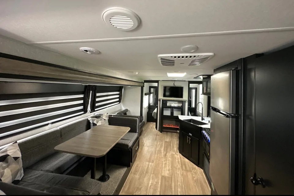 This trailer has warm modern vibes. It comes with built in USB plugs beside beds, a tv, and two outside trailer doors - 1 of which opens to bathroom convenience so that you don't have to walk through trailer.