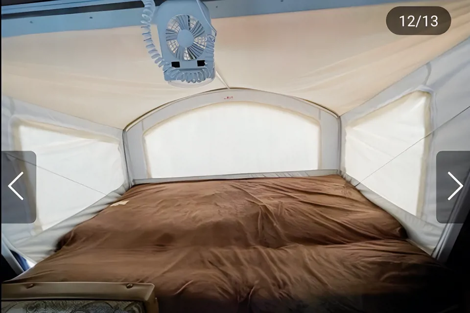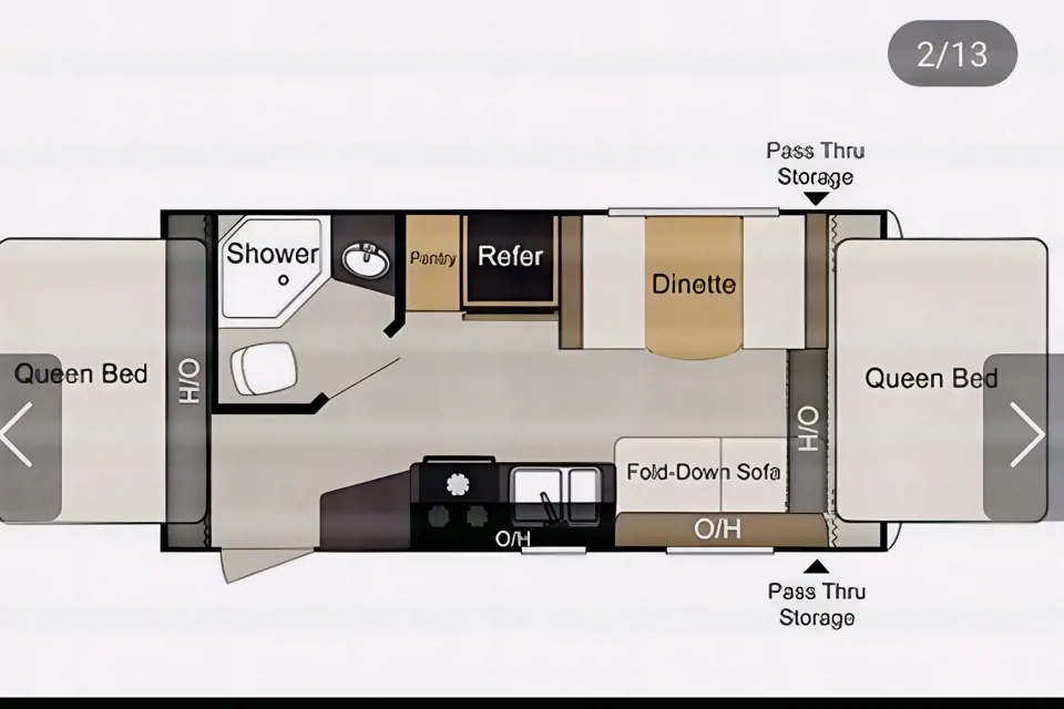 Tiny but Mighty!! If you like tenting but still miss the creature comforts of home, than this is your baby! Full-sized amenities like: bathroom, shower, fridge, freezer, A/C, furnace for those chilly nights, microwave, tv and more. Each end folds down into a queen size bed and the daybed folds down into a bed for one. The table can also be used as a bed if need be. There are many storage cabinets for your towels and bedding, board games and books. Outside you can make use of a power awning for shade on those sunny or rainy days. Outdoor power outlets and speakers make for a wonderful outside experience while you cook your breakfast, brew your coffee and listen to your favorite music. Enjoy your camping experience with this cozy camper. This camper is only for highway travel, if you’re planning on gravel travel, you’ll have to keep checking. 😌