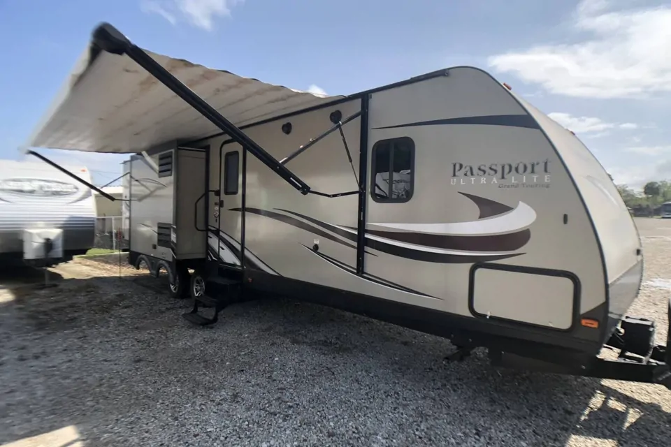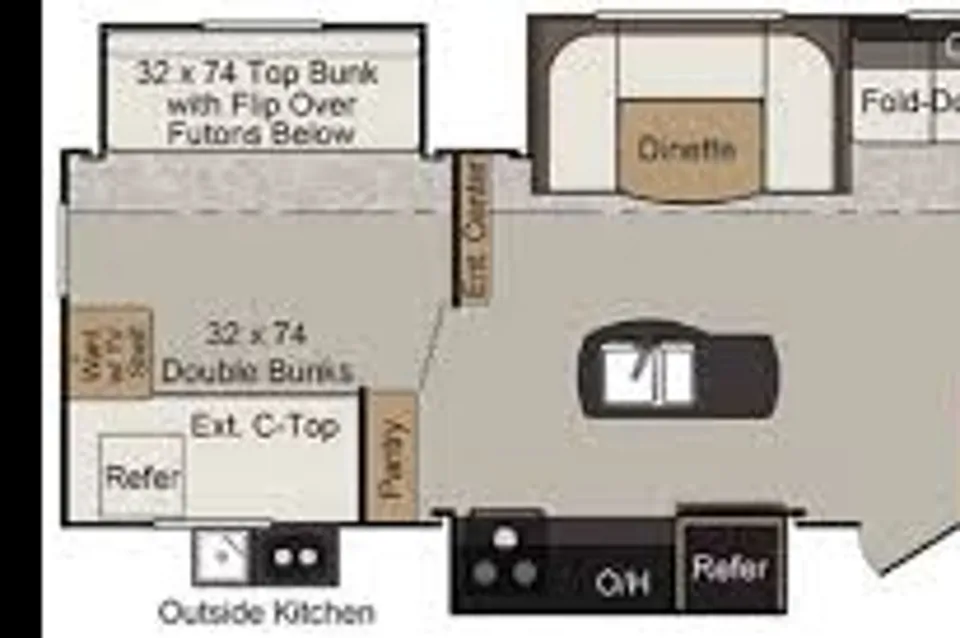 Ample space inside with 3 slide outs. 3 Bunks in the back, with a queen bed in the front.