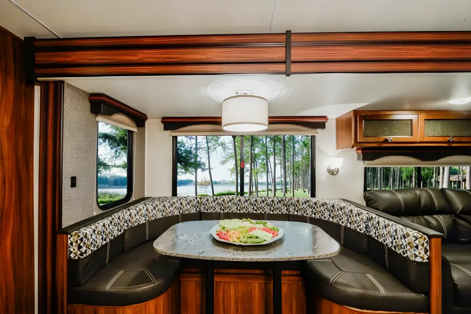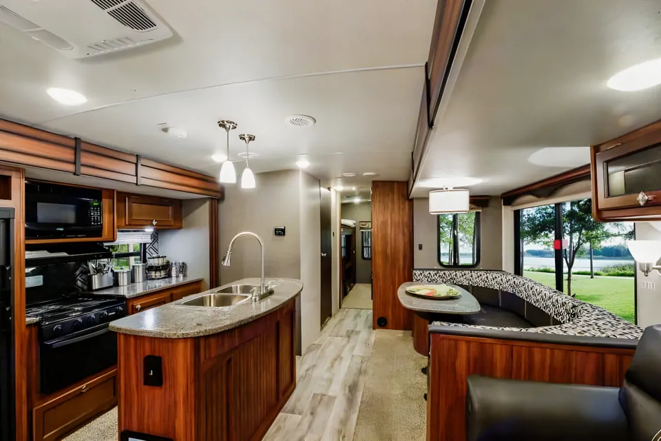 Restful and Easy. The massive windows in the living and dinning rooms can provide great views or close the shades and create a cozy cabin feel. No matter the weather this camper is comfortable with heat and ac vented into every room. The well thought out and spacious floor plan (with opposing large slides) provides enough room for everyone in your party to stretch out and relax in their own space.