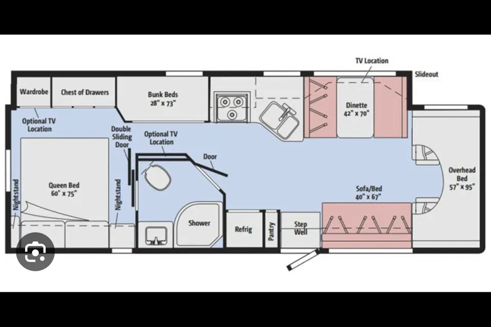 • Fully equipped kitchen for easy meals on the road—refrigerator, microwave, stove, and plenty of storage - plus disposable paper goods