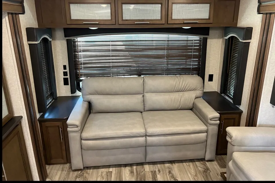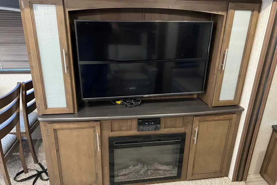Beautiful sleeper trailer that sleeps 4 with comfort. Trailer comes with a king size master bedroom with 42” tv. Other bed is a full size pull out. Full kitchen with all amenities included. Two king size recliners to relax and watch 55” tv in living room. Fireplace for winter time. Comes with outside awning and inside and outside stereo with Bluetooth. Outdoor kitchen as well with outside fridge and bbq. Trailer is immaculate and comfortable.