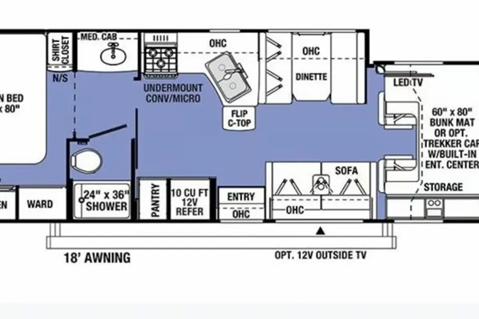 -> Comfortable Sleeping Arrangements: Sleeps up to eight with a queen-sized bed in the private bedroom, an over-cab bunk, a convertible dinette, and a sofa bed.