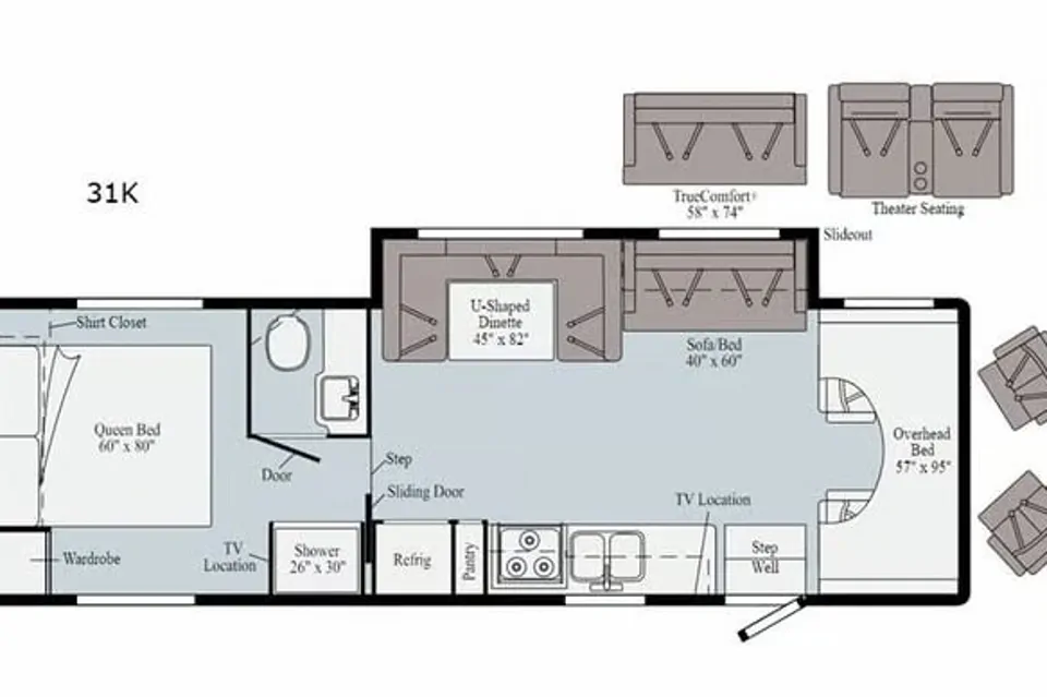➝ Ample Sleeping Capacity: Comfortably sleeps up to 8 with a private queen bed, over-cab double bed, sofa bed, and convertible U-dinette—ideal for families and groups.
