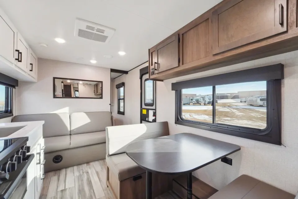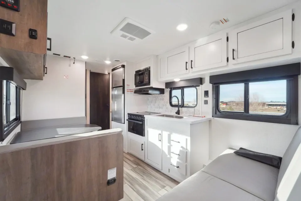 Inside the Go>Play, the Nordic Shore interior aesthetic beckons with its seamless blend of modern and contemporary elements. Lighter colors and durable materials create a cozy atmosphere without compromising structural integrity. With a strong foundation in residential construction practices, this RV is built to endure your adventures.