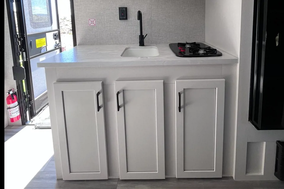 There is room to sleep up to 4 people comfortable with the 29" x 75" bunk beds and on the front queen bed. There is also added living space thanks to the single slide. This RV has a booth dinette. The kitchen has an 8 cu. ft. 12V refrigerator, microwave, and two-burner range.