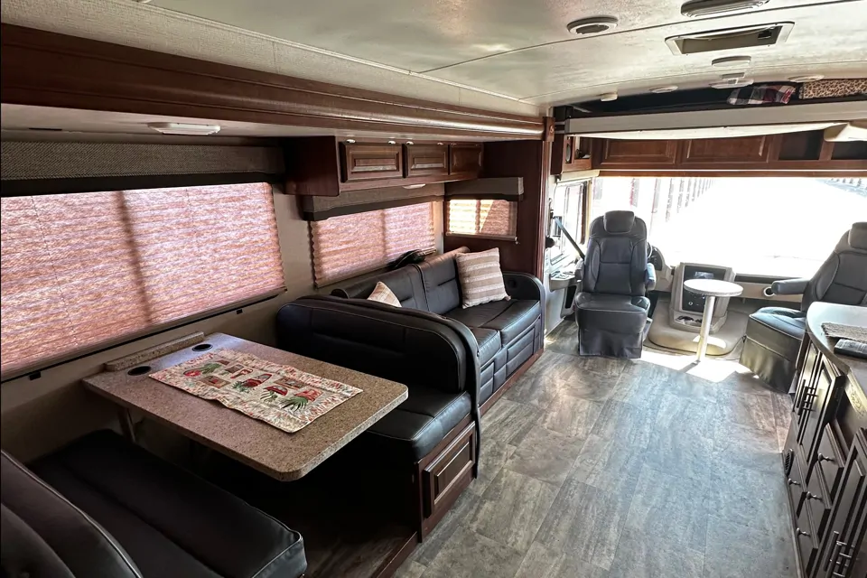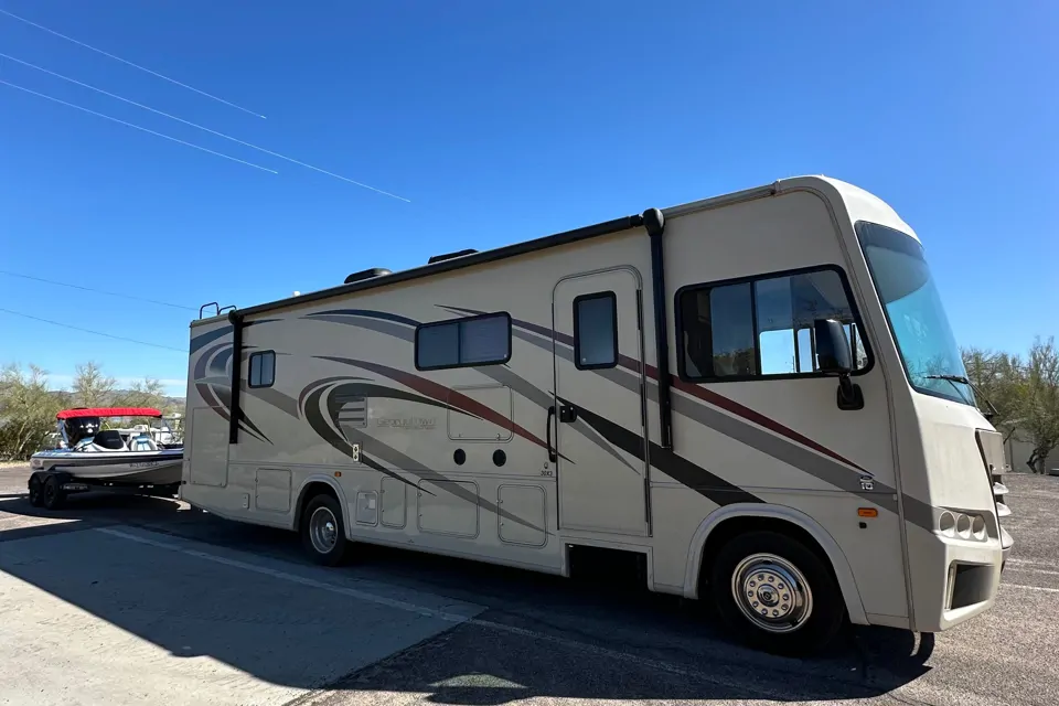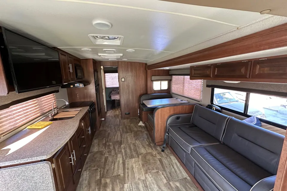 Have a blast in our 32' Class A Georgetown! Dunes, desert, hunting, fishing or just road tripping this motorhome is ready. Included is a Blackstone flat top in the outdoor kitchen and BBQ to cook, full kitchen and lots of storage to bring all your ice chests. Captains chairs turn to face the living room to hang out with friends. Dinette folds down to a small bed for the kids, couch pops out to a full size bed, bunk bed drops down above the driving area for another bed or storage, and the master quarters has a King size bed. Outdoor speakers to play music and a tv outside to catch the game. Just pull up to the spot hit the auto hydraulic jacks and you're ready to camp.