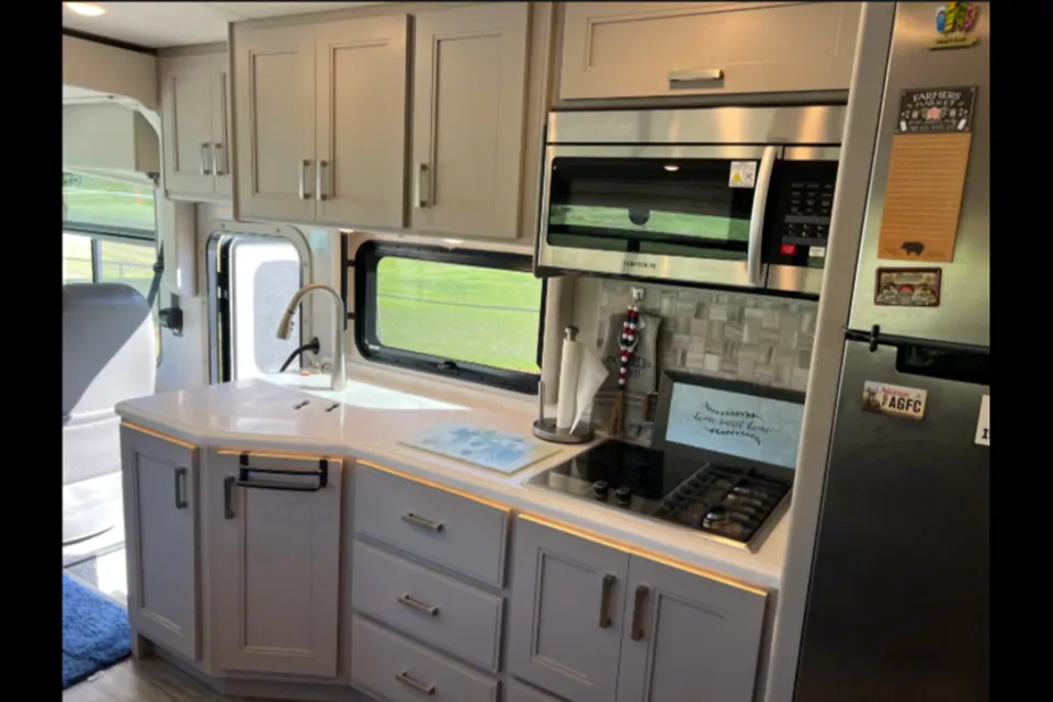Spacious and Well-Equipped: Modern kitchen with full-size fridge, stove, microwave, and ample storage. Perfect for preparing meals on the go.
