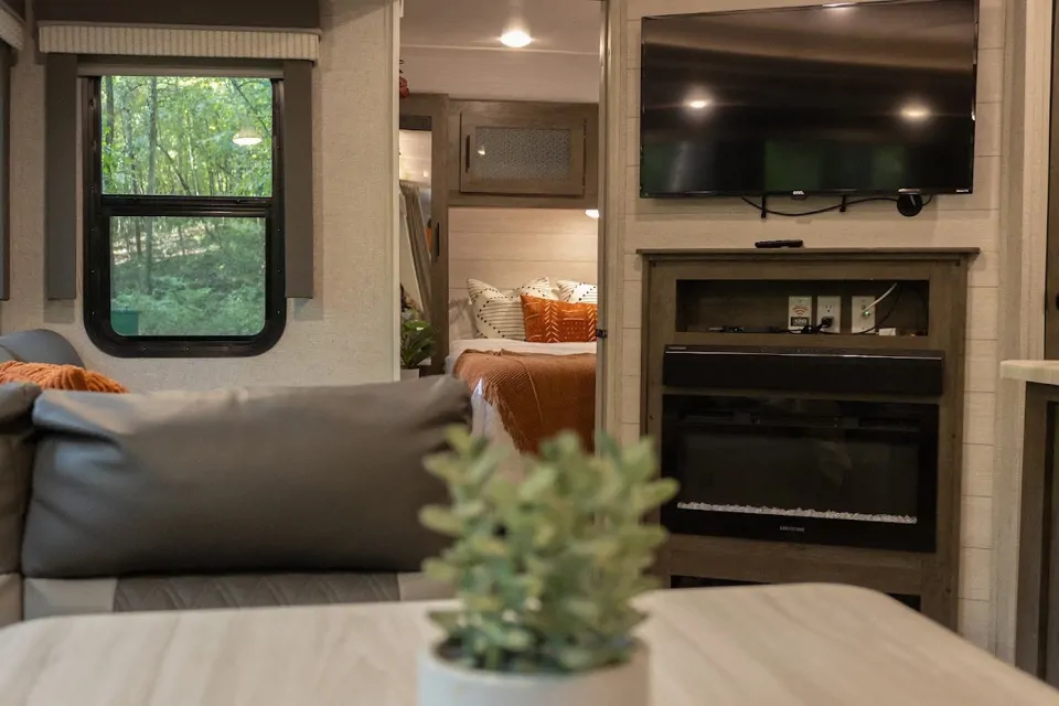 Modern Amenities: Experience the convenience of home while on the road. Our travel trailer features a fully equipped kitchen complete with a refrigerator, microwave, stove, and sink. Stay entertained with a flat-screen TV and DVD player, and keep everyone comfortable with air conditioning and heating systems.