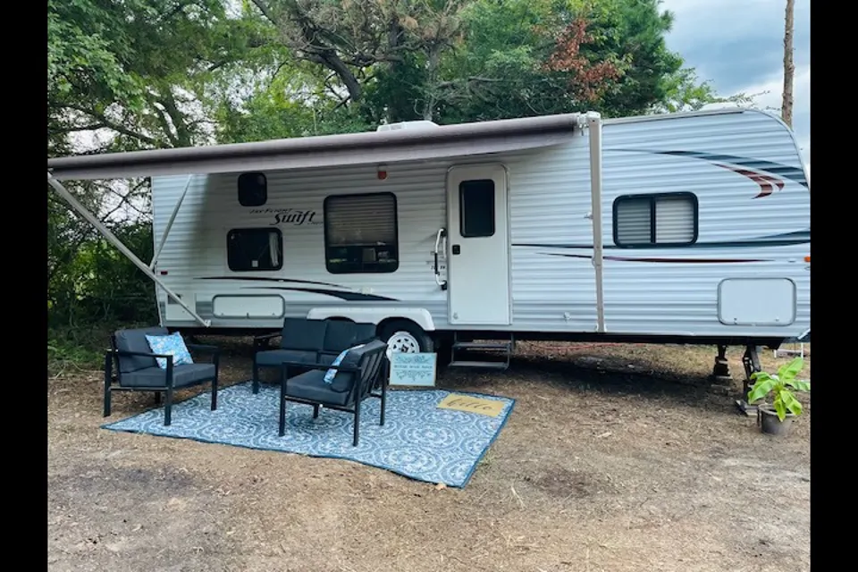 Enjoy a relaxing stay in our 2011 Jayco Jayflight Swift. Delivered within 50 miles to a campsite of your choosing. The camper is complete with a main bedroom containing a full size bed, twin over full bunks, small but full bath and kitchen/dining/living space. The kitchen has a 3 burner stove, microwave, fridge, toaster and coffee maker. There is a Roku TV that you can hotspot to. Three Camp chairs and a propane grill are supplied.