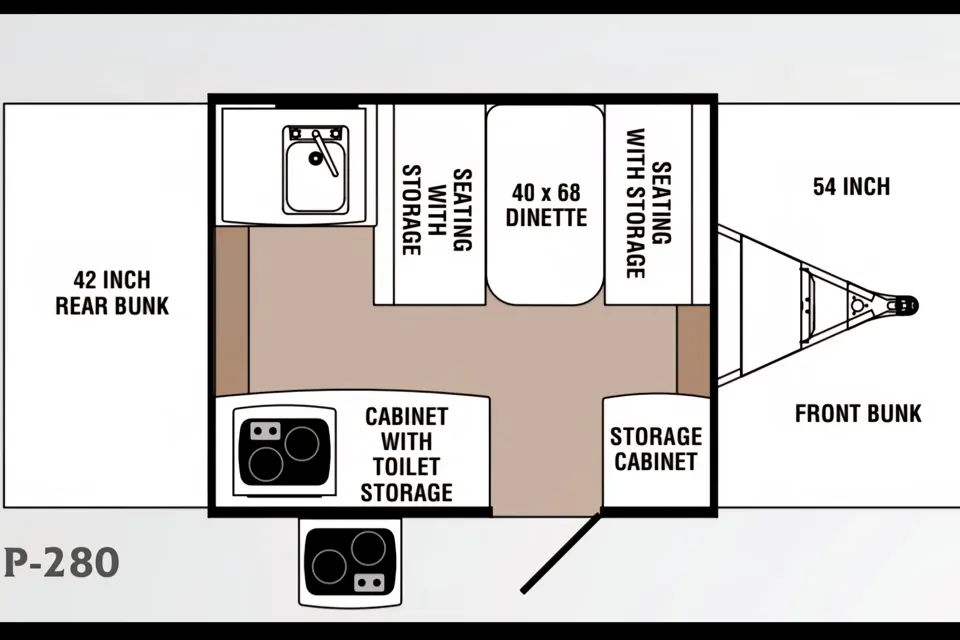 This cozy camper has a twin and full size bunk along with a dinette that converts into an extra sleeping space along with a propane furnace to take the chill out.