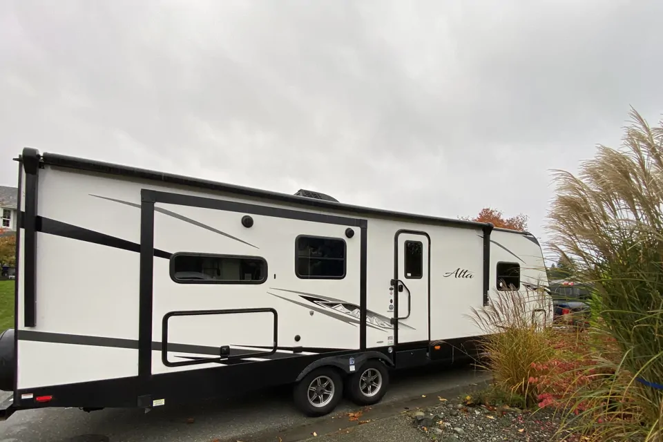 Here is your perfect couples get away trailer with double opposing slides , kitchen island and a rear lake ocean view back window with office space to work remote and make the boss think you are still at work,