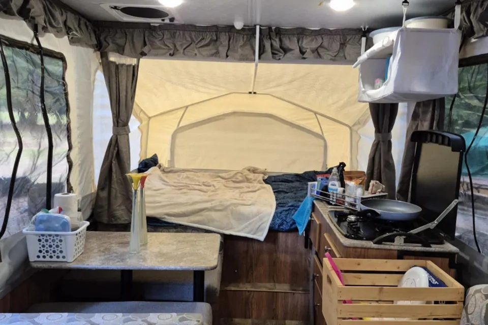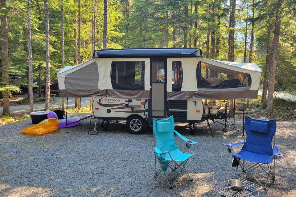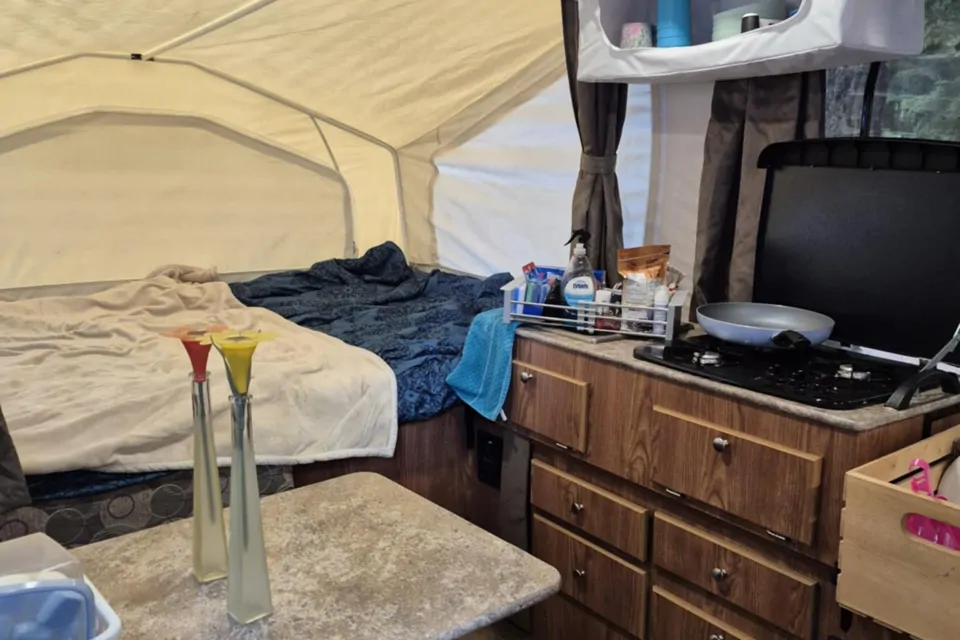 Ready for family adventures on wheels....our 2017 tent trailer will allow you to sleep in comfort with two slide outs with queen beds and a dining conversion to bed as well as a couch pull out to bed. Room to hang out and dine as well as a functional kitchen area and a propane stove outside trailer and inside propane cooking stove and propane fridge. Propane Furnace for chilly nights and water. Electricity and water hook up available. Comes with plates, pots, pans etc. Add ons available ie: firepit and second propane tank and gazebo and bedding etc... just ask.