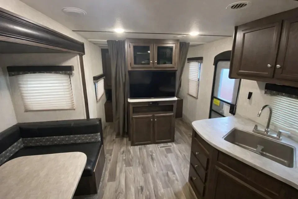 Cozy Autumn Ridge 24BHU Travel trailer with all amenities - air conditioner, heater, stove, microwave, fridge and full washroom. It has a full size queen bed, a dinette table that converts to a full size bed and double bunks for all the space your family needs!
