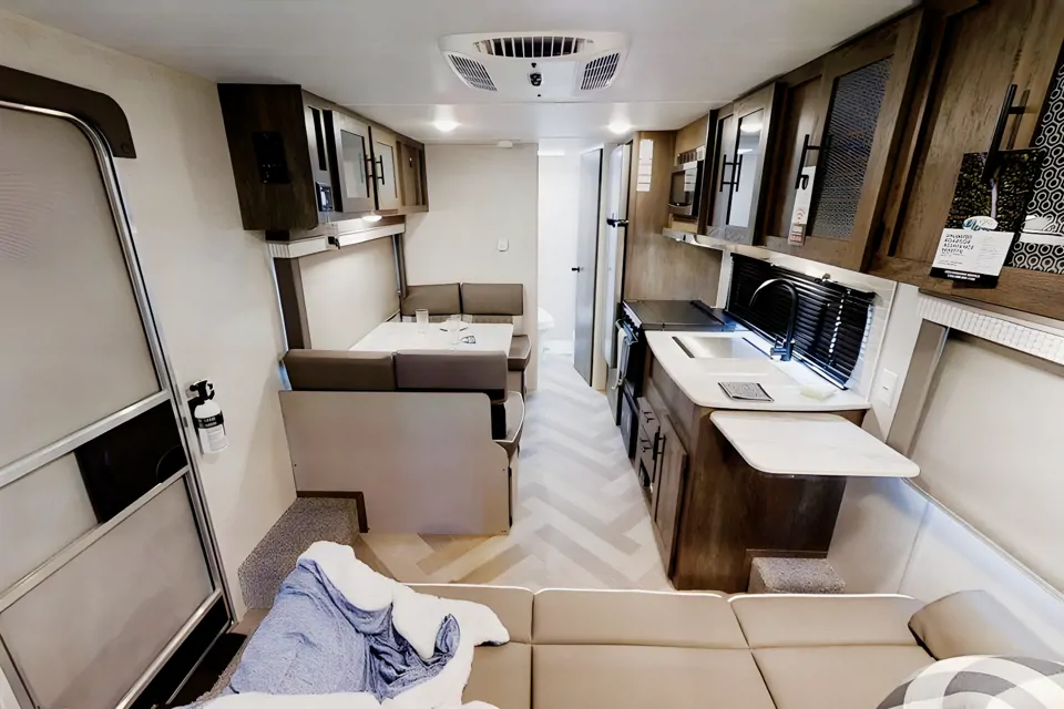 Do you need a spacious bathroom and a queen bed? Well then, check out this travel trailer! There are closets on either side of the queen bed and a privacy curtain that can be drawn at night. Grab some eggs and bacon from the oversized 11 cu. ft. refrigerator and fry them up on the three burner cooktop then head to the booth dinette to enjoy eating them there comfortably. The sofa is a great place to wind down your nights, especially after showering in the walk-in shower! Extremely clean, great layout for family or couples!