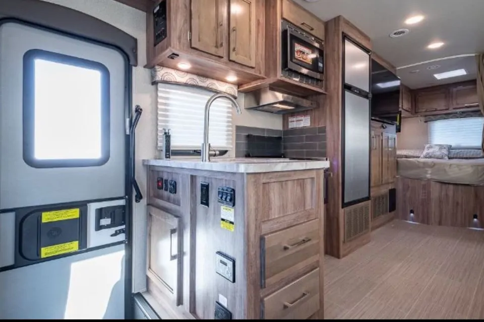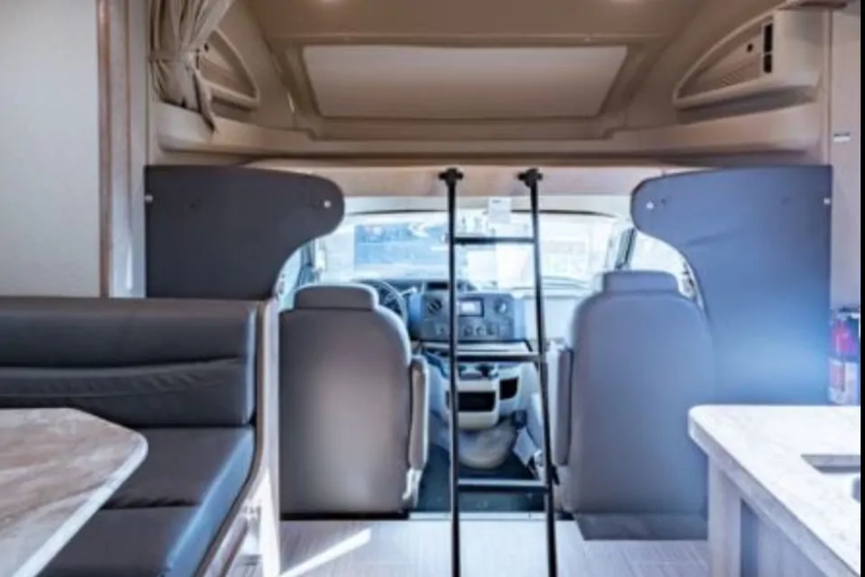 This comfortable and easy-to-drive motorhome is perfect for family trips or weekend getaways. It features a private queen bed at the back, an overhead bunk, a convertible dinette, and a convertible couch—sleeping up to 6 comfortably.