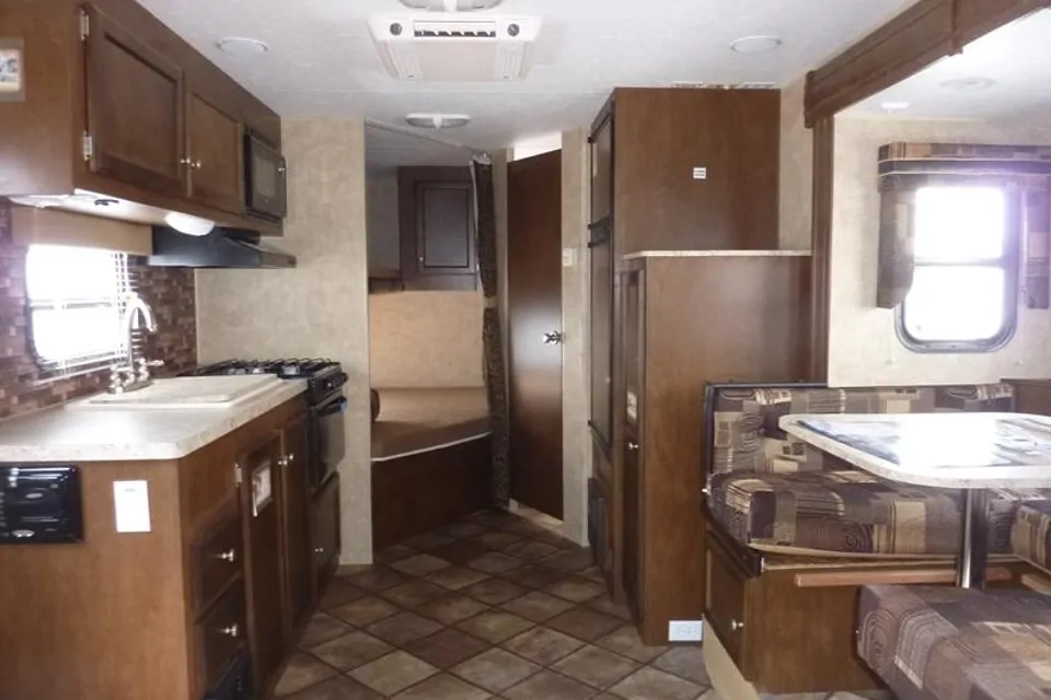 Full bathroom with toilet, tub and shower inside and an additional outdoor shower. Kitchenette includes an oven, microwave, and cooktop that runs on the two propane canisters. Fridge and freezer keep food and beverages nice and cold and the audio has internal and external speakers with CD, Radio and Aux in so you can listen to music inside or outside under the electric awning.