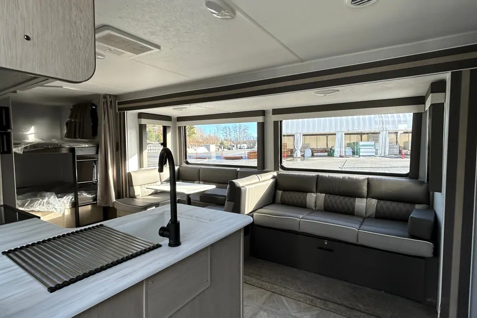 The large slide-out creates extra space with a U-shaped dinette and cozy sofa for relaxing after a day of beachcombing or hiking 🛋️🌲. Kids will enjoy the double-size bunks in the back—perfect for sleepovers or extra guests—and they’re right next to the full bathroom 🚿 for easy access.