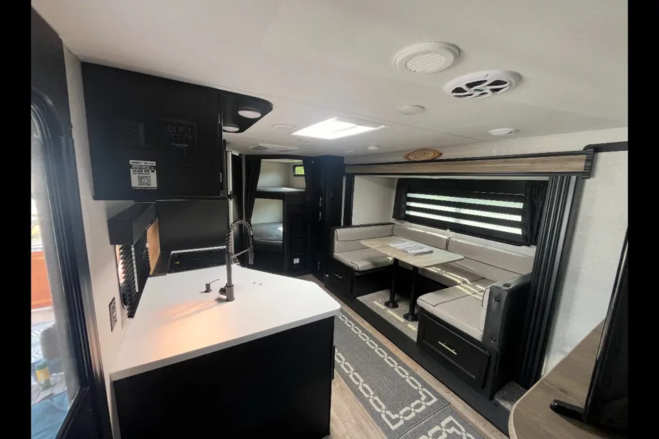 Setting up camp is a breeze any time of day thanks to the power awning with LED lighting and power tongue jack. Inside, you'll find a spacious dinette that converts into an additional sleeping area, a fully equipped kitchen with a large pantry, and a full bathroom. Plus, there's an outdoor mini-fridge and ice maker for entertaining!