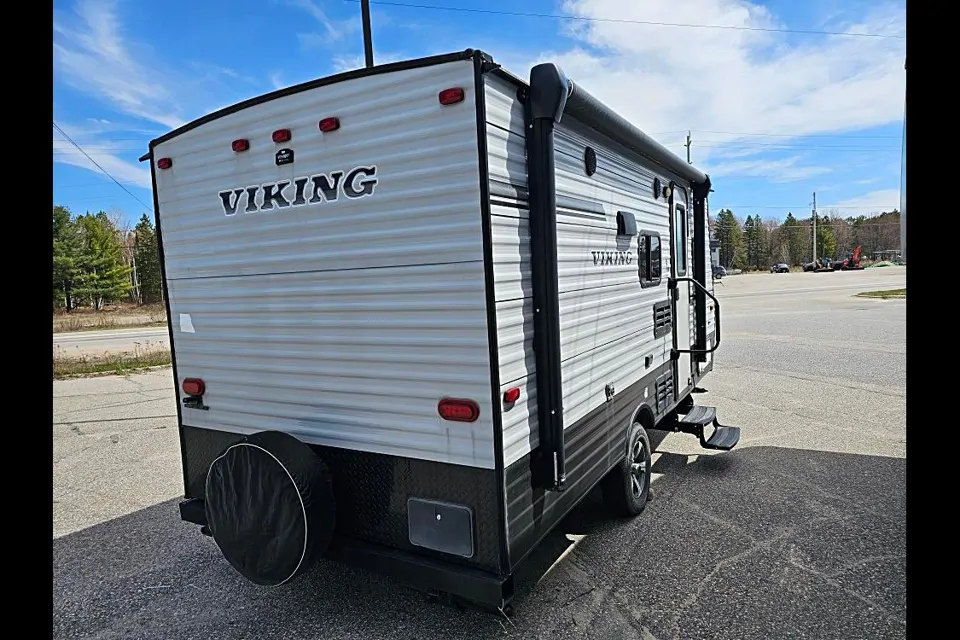 Lightweight bunkhouse model sleeps 6 (queen, bunks, dinette).