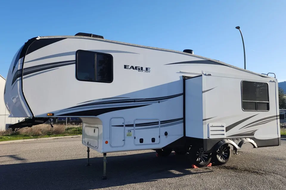Looking for the perfect getaway on wheels? This brand-new Jayco 26-foot 5th wheel trailer is ideal for couples or small families (sleeps 4 comfortably – even room for a playpen!).