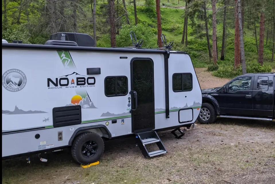 2021 No Boundaries 19.8 is an off grid travel trailer, complete with all the amenities including off road package, solar panel, outdoor shower, outdoor griddle, cold weather package, propane furnace, electric/ propane fridge/freezer, inverter, kayak rack & bike rack.