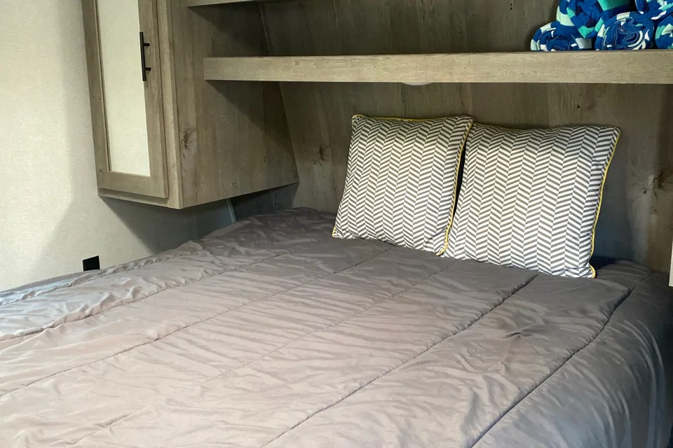 Quad bunks give everyone their own bed with a slide door. Queen bed up front with a regular mattress for comfort so you will have a great night sleep. Dinette makes a double. Jack knife sofa would sleep 2 smaller kids, it's not suitable for adults. Air-con and fireplace. Bluetooth stereo with outside speakers. Please note there is no TV.