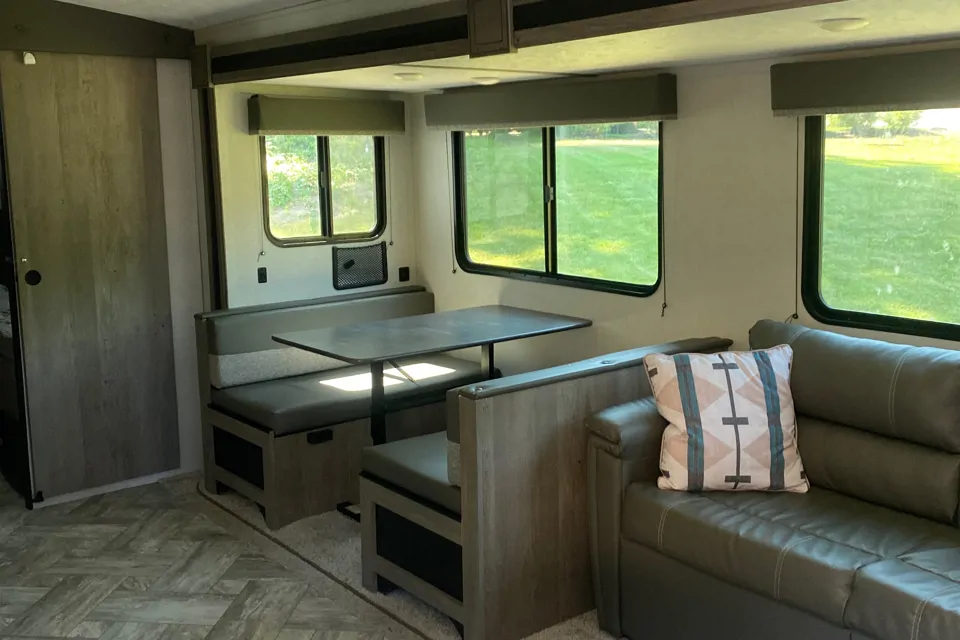 Enjoy our new Keystone travel trailer that has everything you need to relax in the great outdoors. Inside you will find a full kitchen and bathroom. Outside kitchen with 2 ring gas hob and refrigerator. Portable gas BBQ available if you would like it.