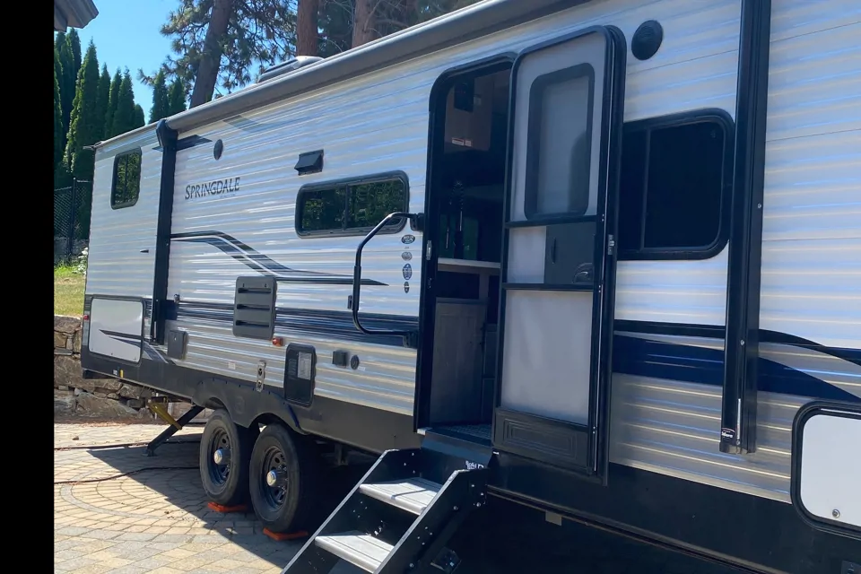 Electric stabilizer jacks. Can tow with half ton truck with min 8500lbs towing capacity and must have towing experience. Anti-sway weight distribution hitch fitted. We will provide the correct towing ball. Reversing camera and bed linen/ towels are available upon request for additional fee. Please provide your own pillows. Sorry, no pets.