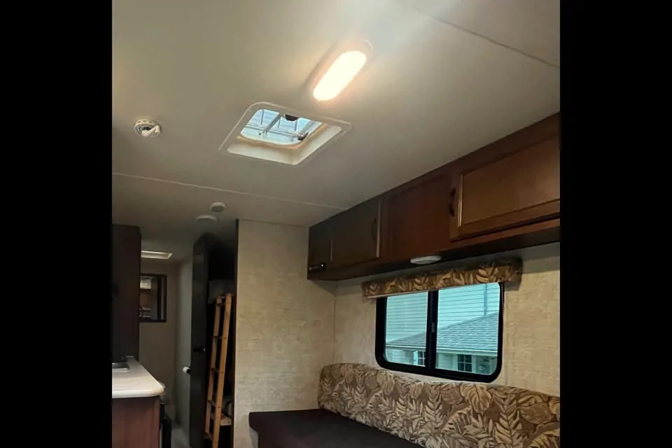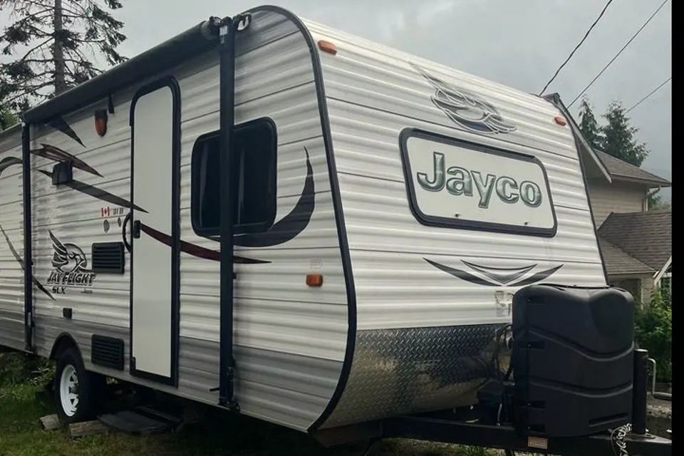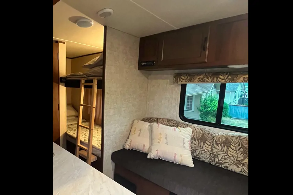 When we're not camping, our family rents out our Jayco JayFlight SLX trailer, which can sleep up to five people. It's perfect for four, with an extra sleeping spot on the couch. The table converts into a double bed, and there are single bunks in the rear.