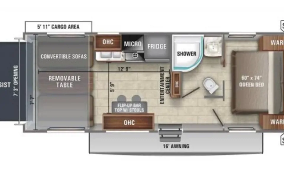 This 2022 modern unit has all the amenities expected and required for your comfort during your well deserved down time PLUS the the added option of being capable of bringing your own toys, perfect for the avid or occasional outdoorsman/woman.