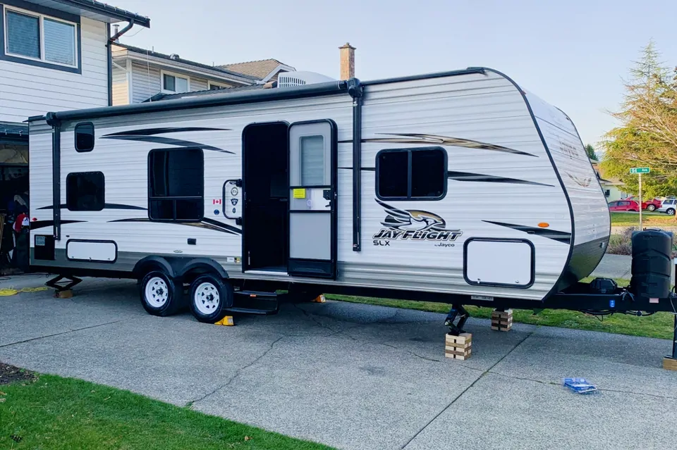 This 26 foot travel trailer (Jayflight 264BHW) can sleep 6-8 people. 2 adults can sleep on the walk around queen bed with brand new memory foam mattress, located in the front of the trailer. 4 people can sleep in the back bunk area (ideally suited for children). The couch and kitchen table can pull down into beds to sleep 2 people each (although this would be cozy and more ideal for children or 1 adult each).